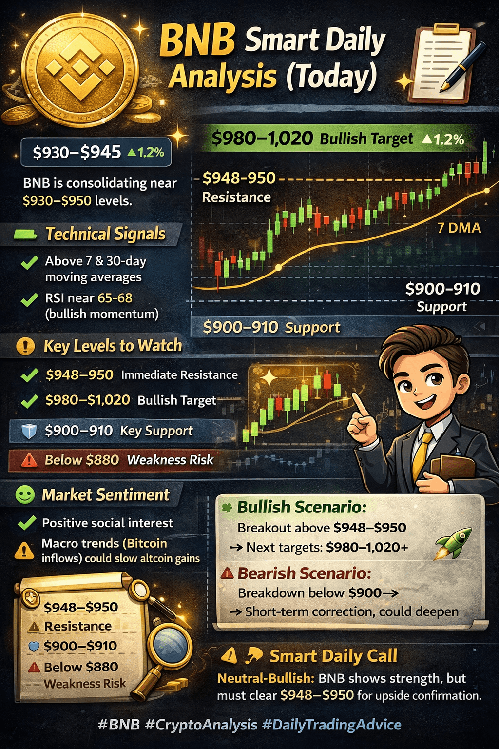 Jeśli BNB zamknie się powyżej silnego oporu w okolicach $948–$950 przy dobrym wolumenie → następne strefy docelowe mogą wynosić $980–$1,020+.