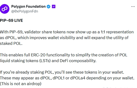 🔸 Użytkownicy, którzy już stakingują POL, nie muszą nic robić; tokeny dPOL automatycznie pojawią się w ich portfelach. Polygon podkreśla, że to NIE rozdanie darmowych tokenów, a użytkownicy powinni być ostrożni podczas podejrzeń o oszustwa wykorzystujące tę akcję.