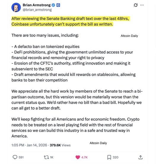 W szczegółowym wątku opublikowanym na X, Brian Armstrong wyjaśnił, dlaczego Coinbase uważa, że wersja senacka jest „znacząco gorsza od status quo”. Główne zastrzeżenia firmy obejmują: