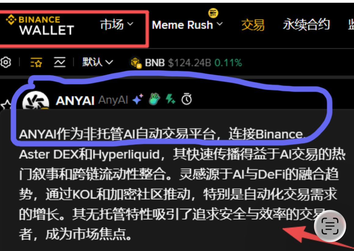 W takim podziale rynku, token ANYAI na (BNB Chain) idealnie wpasowuje się w podwójnie gorący tor „AI+Meme”. Jako projekt skupiający się na niezarządzanym automatycznym handlu AI, nie tylko łączy płynność z wielu platform, takich jak Binance, Hyperliquid, pozwalając użytkownikom korzystać z automatycznych strategii handlowych napędzanych AI bez oddawania kontroli nad swoimi aktywami, ale także opiera się na społecznościowym rozprzestrzenieniu tematów, co idealnie odpowiada obecnemu rynkowemu zapotrzebowaniu na „efektywne narzędzia + gorące narracje”.