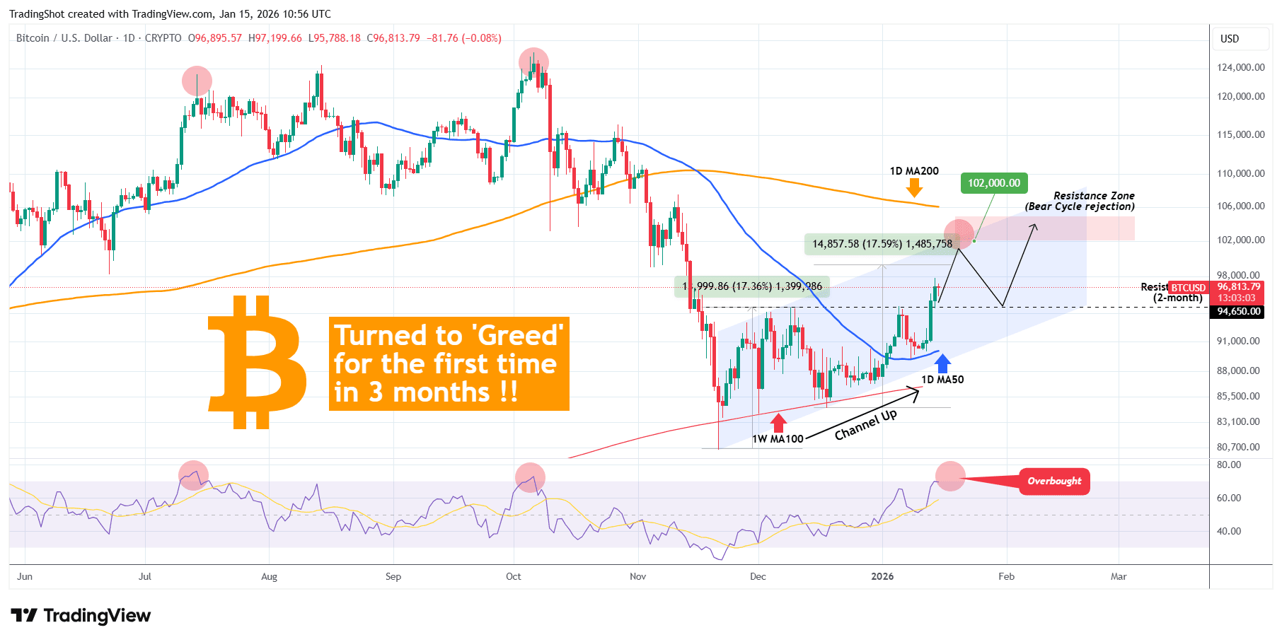 Z powodu przekształcenia 1D MA50 (niebieska linia trendu) w wsparcie i potwierdzenia tego po przetestowaniu 8 stycznia, możemy zaobserwować powstanie krótkoterminowego kanału wzrostowego.