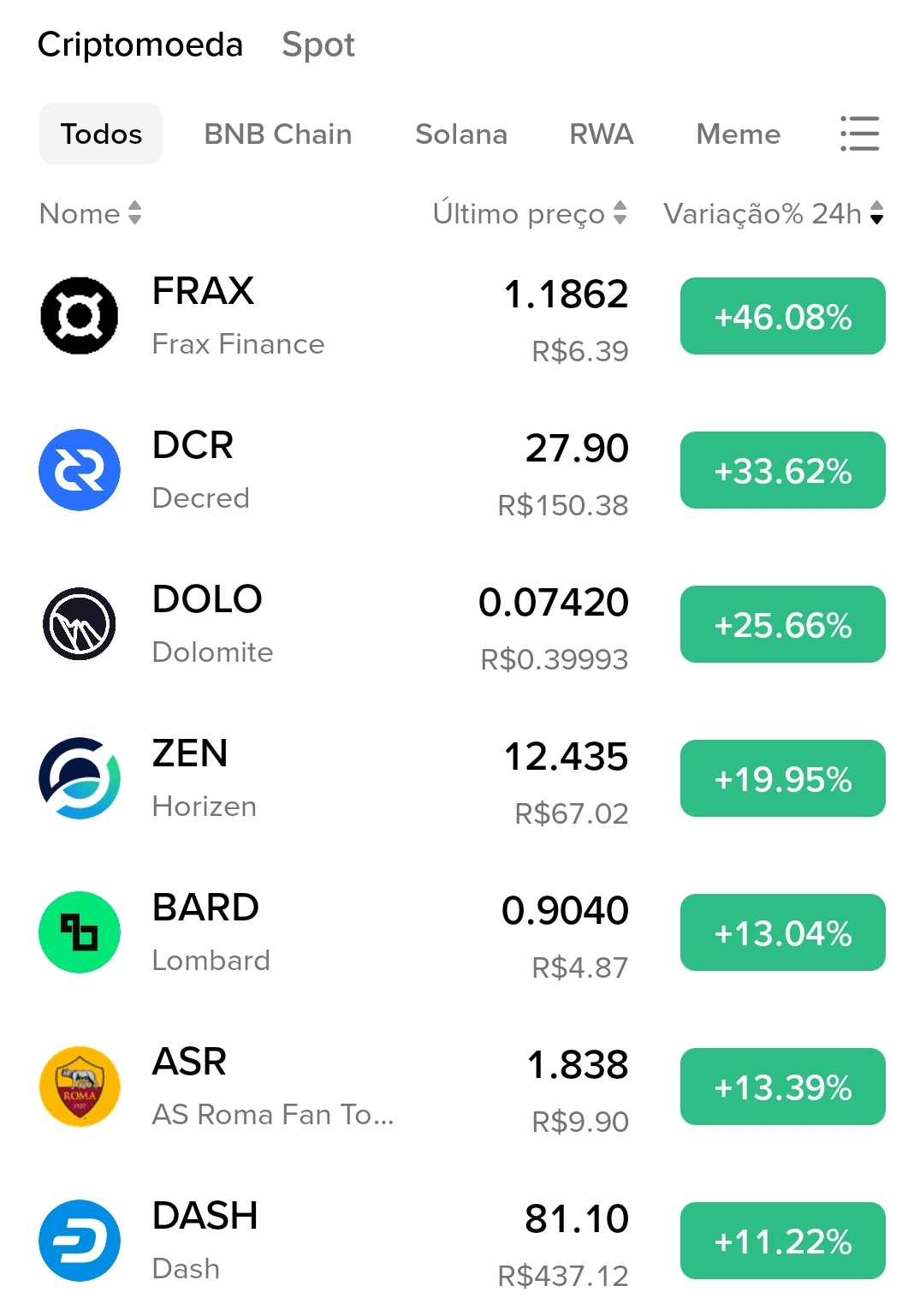 🔹 ASR (AS Roma Fan Token) – 1,838 USD | 9,90 BRL | 🔺 +13,39%