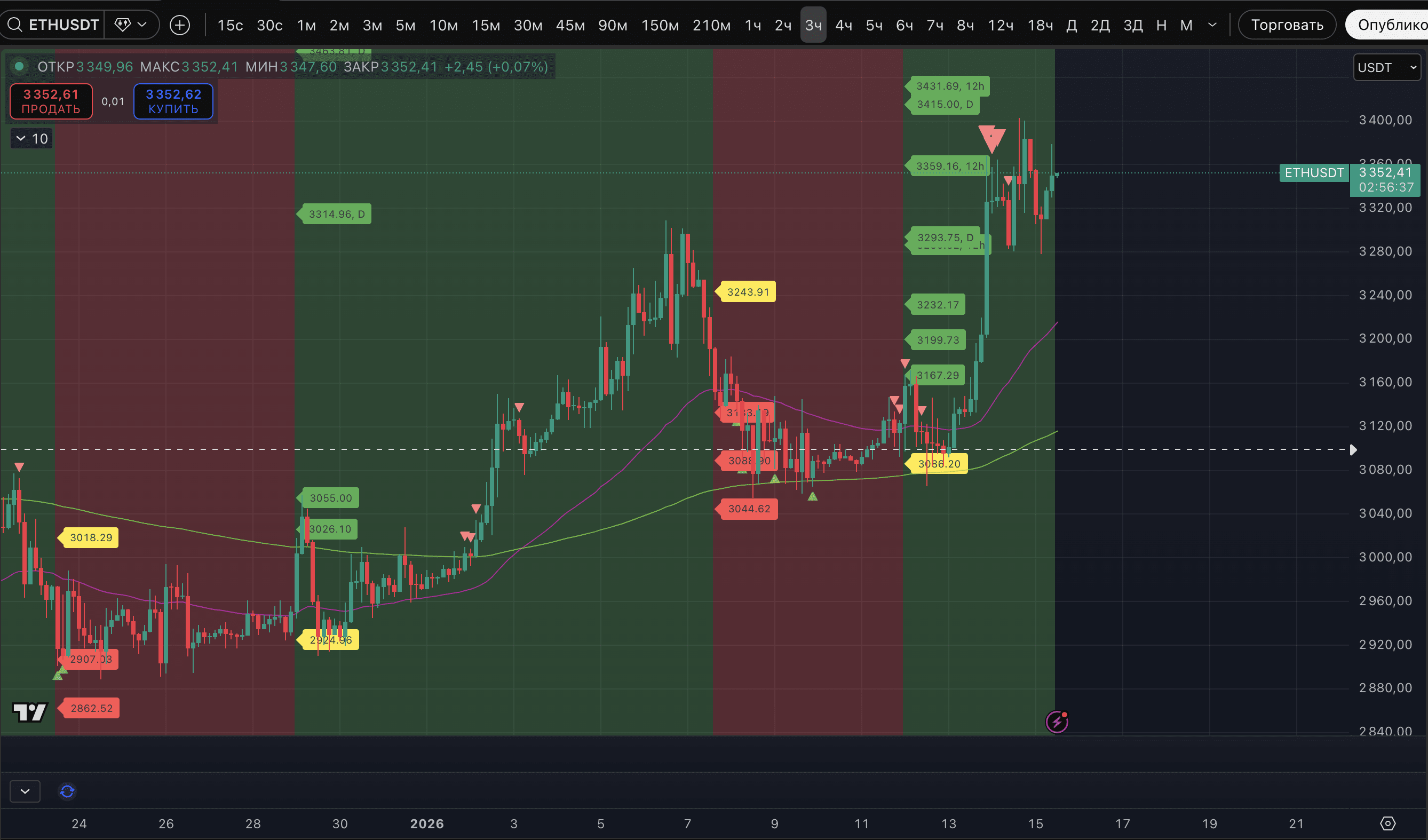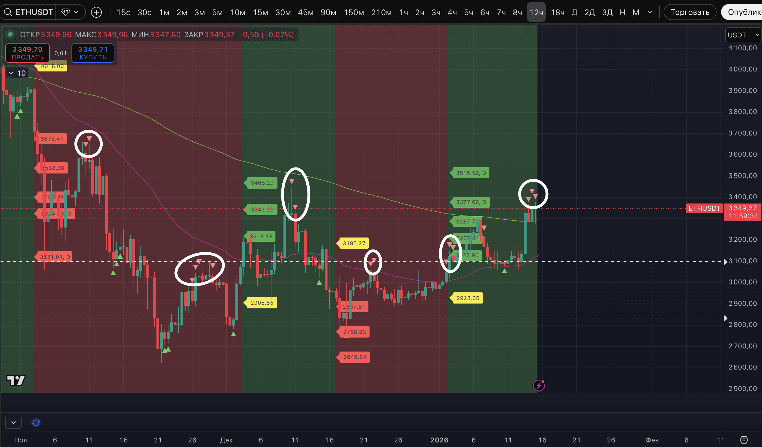 Przypominamy, że nasz long na #ETH zakończyliśmy wczoraj, przy kursie 3 329,15$. Cena potem wykazała przejście do 3 402$. Ale nie ma powodu do żalu - pozycja została zamknięta z argumentami i zgodnie z strategią. I cena wciąż nie przekroczyła tego poziomu. Powodem do zamknięcia były silne sygnały potencjalnego hajów na TF 3-godzinnym. I widać, że obecnie nie zostały one złamane. Przejście miało miejsce, ale nie złamanie.
