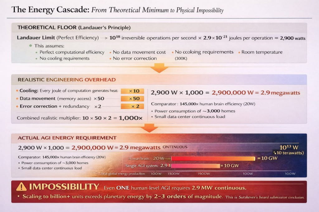 W dołączonych do publikacji profesjonalnie przygotowanych slajdach twierdzi się, że AGI wymaga 1018 nieodwracalnych operacji na sekundę. Mnożąc przez energię Landauera, autorzy uzyskują teoretyczne minimum 2900 W – 145 razy większe zużycie energii ludzkiego mózgu.