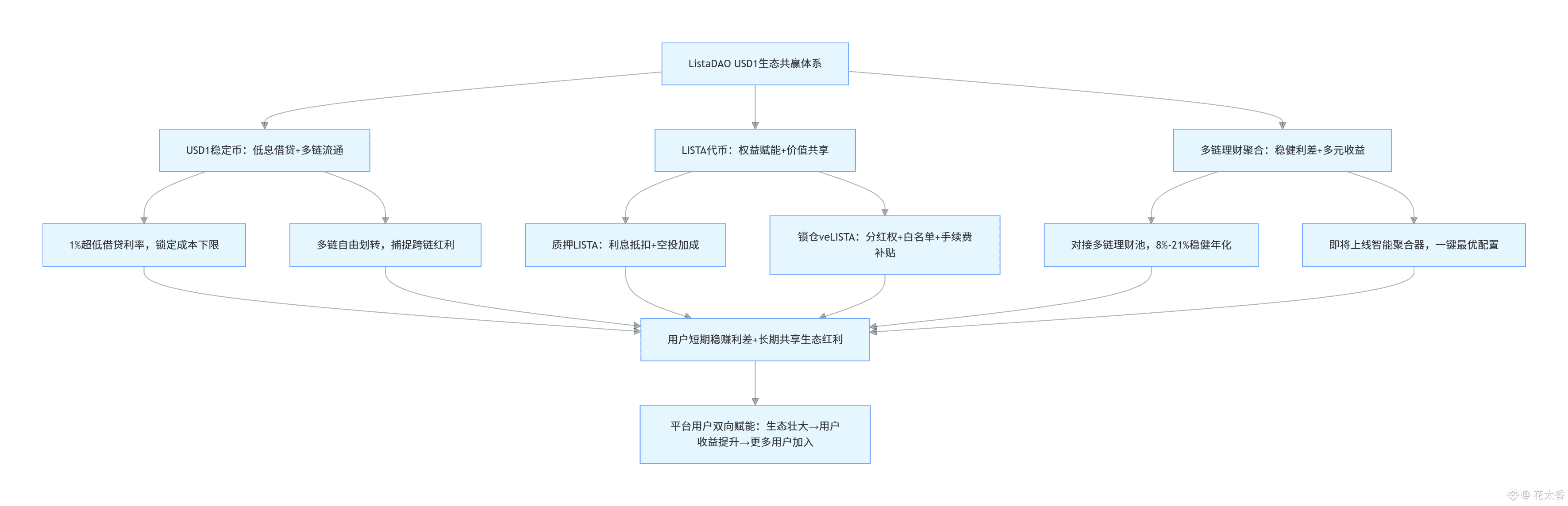 从生态发展的角度来看,ListaDAO 的布局正在逐步显现出长远价值。一方面,平台持续拓展多链合作版图,将 USD1 的流通范围从以太坊、BSC 延伸到 Polygon、Avalanche 等新兴公链,让用户能一键捕捉不同链上的理财红利;另一方面,平台积极探索 “加密资产 + 传统金融” 的融合路径,计划对接国债、大宗商品等低风险标的,进一步夯实 USD1 的价值锚定基础。这些动作,都是为了构建一个 “抗风险能力强、收益来源稳定、用户粘性高” 的全域理财生态。