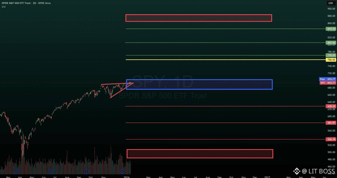 The SPDR S&P 500 ETF Trust, trading under the ticker SPY on NYSE Arca, is currently positioned at $693.77, navigating a critical juncture in its technical structure. This analysis examines the key price levels, trend dynamics, and potential trading scenarios based on the chart pattern.