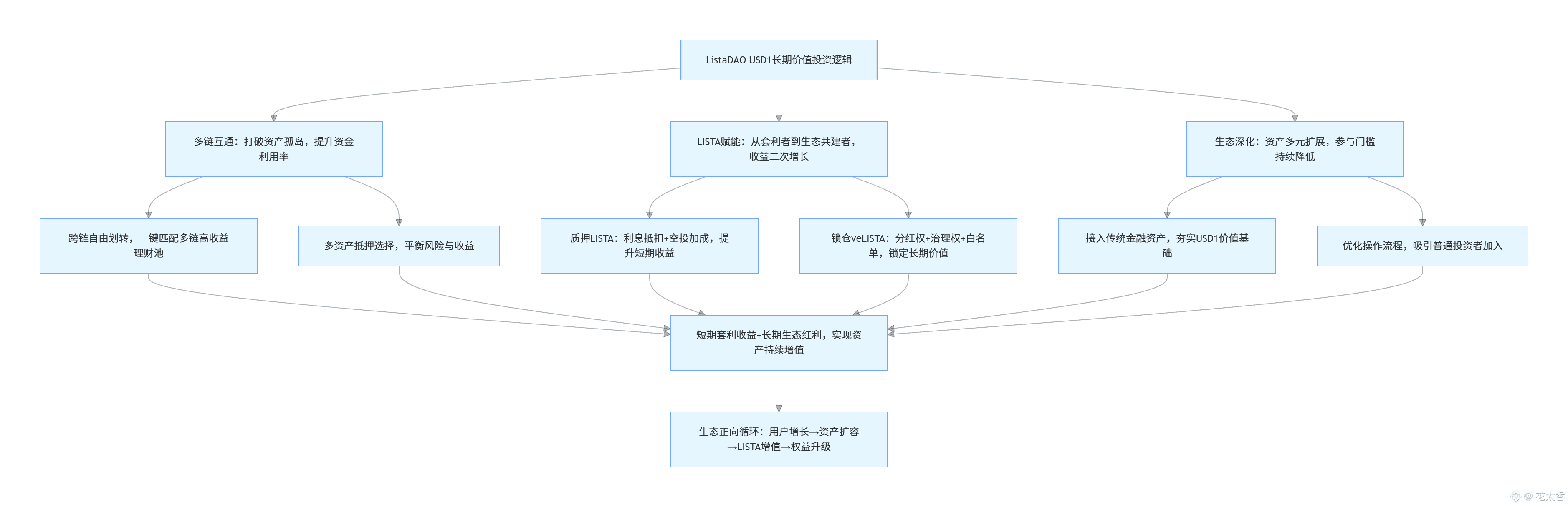 对于长期投资者而言,参与 USD1 生态的策略其实很简单:以套利收益为基础,以 LISTA 锁仓为核心,与生态共同成长。熊市时,抵押稳定币赚取稳健利差,同时用部分收益抄底 LISTA 锁仓,积累更多权益;牛市时,抵押蓝筹资产借贷 USD1,既不耽误持仓资产的增值,又能通过理财赚取额外收益,同时享受 LISTA 代币的价值增长红利。这种 “套利 + 持币” 的组合策略,既能保证短期的现金流,又能抓住长期的生态价值爆发机会。
