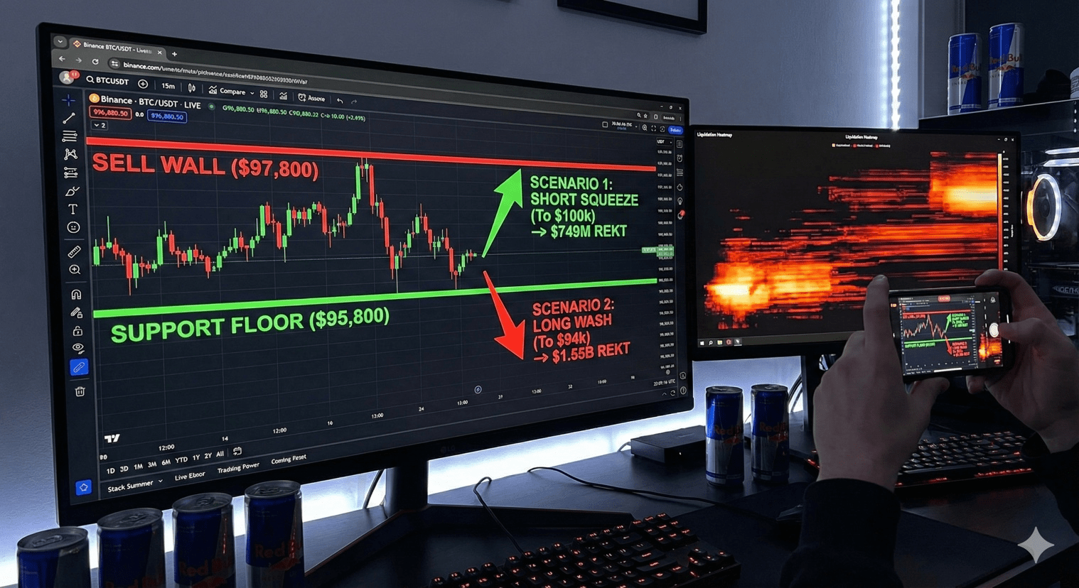 Ostrzeżenie dla traderów: Jeśli zobaczysz nagły, gwałtowny ruch do $97,800, oczekuj "skoku, który łamie grawitację", gdy zacznie się ściskanie. Jednak jeśli nie uda nam się utrzymać $95,800, "Długie pranie" do $94k jest następnym chwytem płynności.