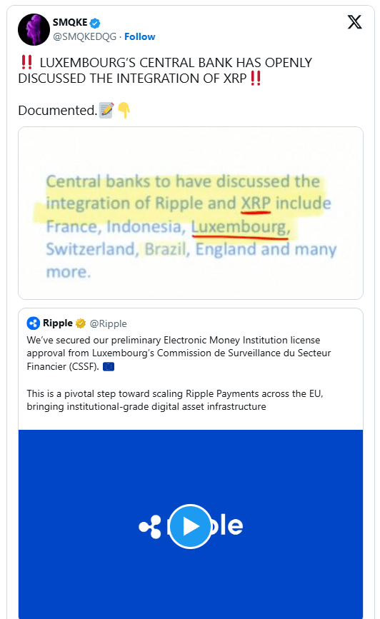 Post SMQKE odnosi się do obrazów sugerujących, że bank centralny Luksemburga rozważał integrację XRP, wraz z wymienieniem innych jurysdykcji, takich jak Francja i Brazylia. Pomimo szerokiego rozprzestrzeniania takich materiałów, żadne dokumenty pierwotne, oficjalne oświadczenia ani publikacje polityczne banku centralnego Luksemburga obecnie nie potwierdzają oficjalnej dyskusji ani decyzji o integracji XRP na poziomie banku centralnego.