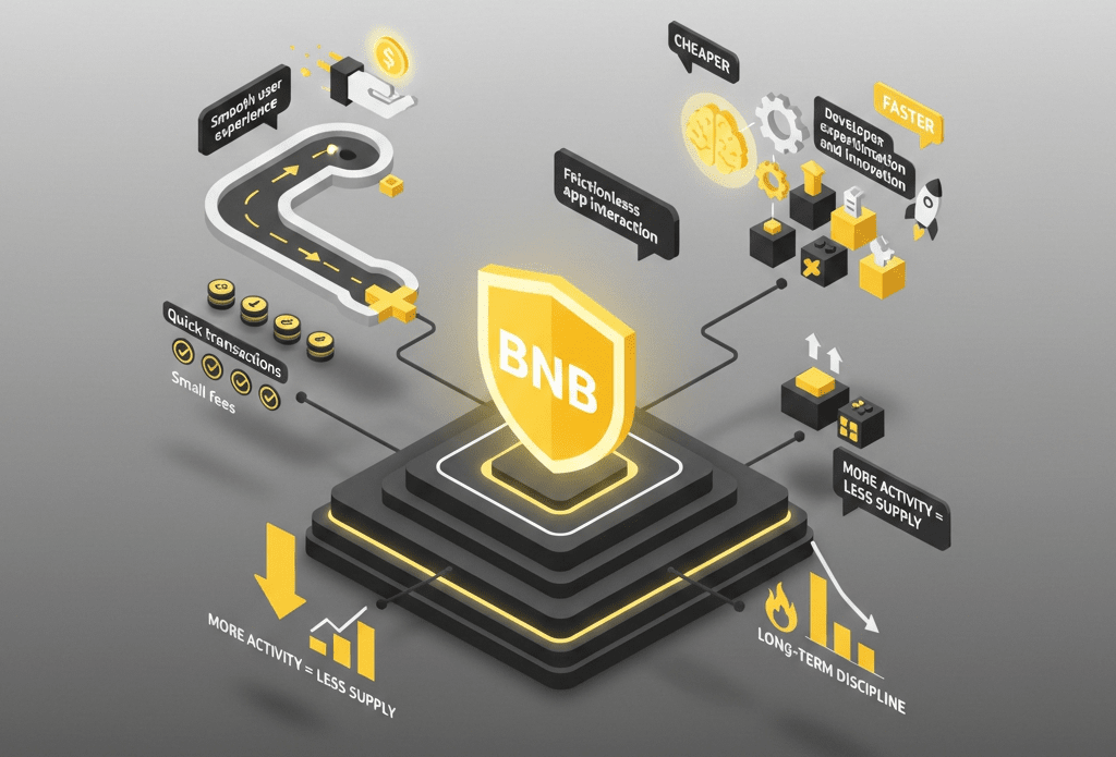 BNB ma znaczenie, ponieważ koncentruje się na robieniu rzeczy dobrze, a nie na robieniu wszystkiego. Dla użytkowników oferuje płynniejsze doświadczenie: transakcje są szybkie, opłaty są małe, a interakcja z aplikacjami nie wydaje się luksusem. Dla deweloperów usuwa tarcia. Budowanie na BNB Chain jest tańsze, szybsze i bardziej wybaczające, co zachęca do eksperymentowania i innowacji. Ekonomicznie, mechanizm spalania BNB wprowadza długoterminową dyscyplinę podaży, która łączy wartość tokena z rzeczywistym użyciem sieci. Więcej aktywności oznacza większy popyt, a z czasem mniej podaży. To tworzy wyraźne połączenie między adopcją a wartością — coś, z czym wiele blockchainów ma trudności.