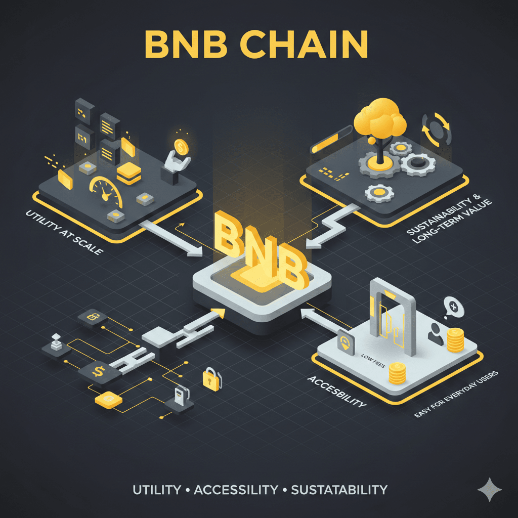 BNB jest zaprojektowane do używania, a nie tylko do trzymania. Napędza transakcje, opłaca opłaty za gaz, zabezpiecza sieć poprzez staking i łączy użytkowników z aplikacjami w ekosystemie BNB Chain.