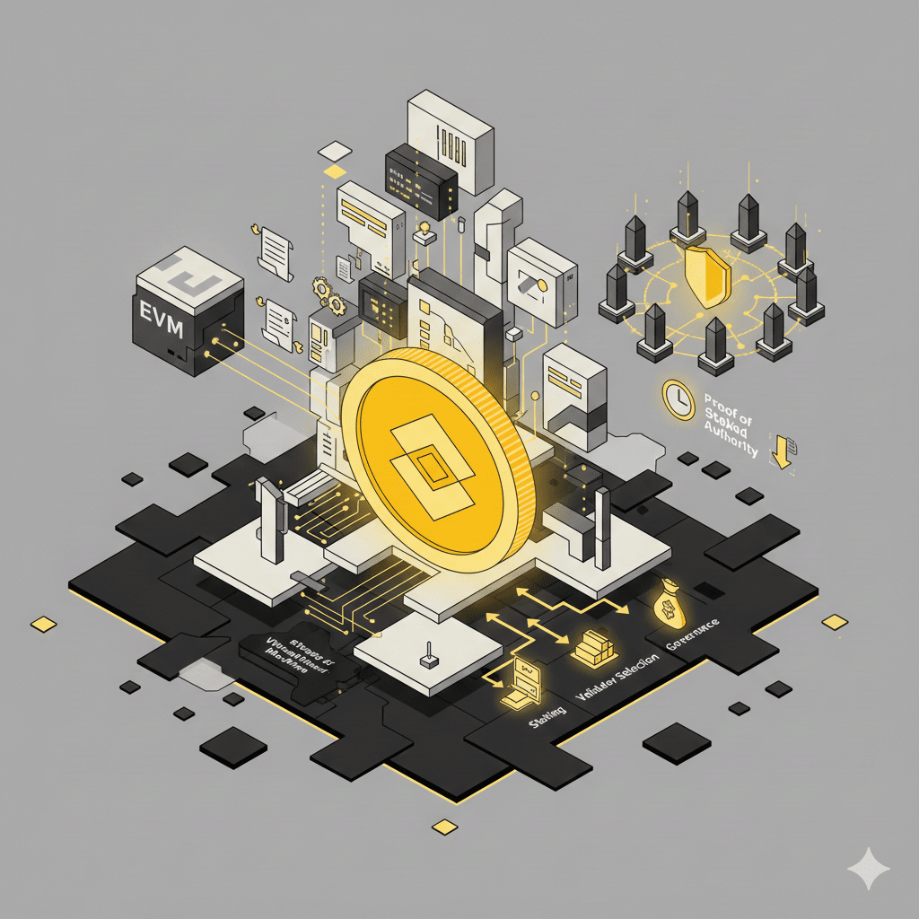 BNB odgrywa również centralną rolę w stakingu, wyborze walidatorów i zarządzaniu, czyniąc token aktywnym uczestnikiem w tym, jak sieć działa, a nie tylko pasywnym aktywem.
