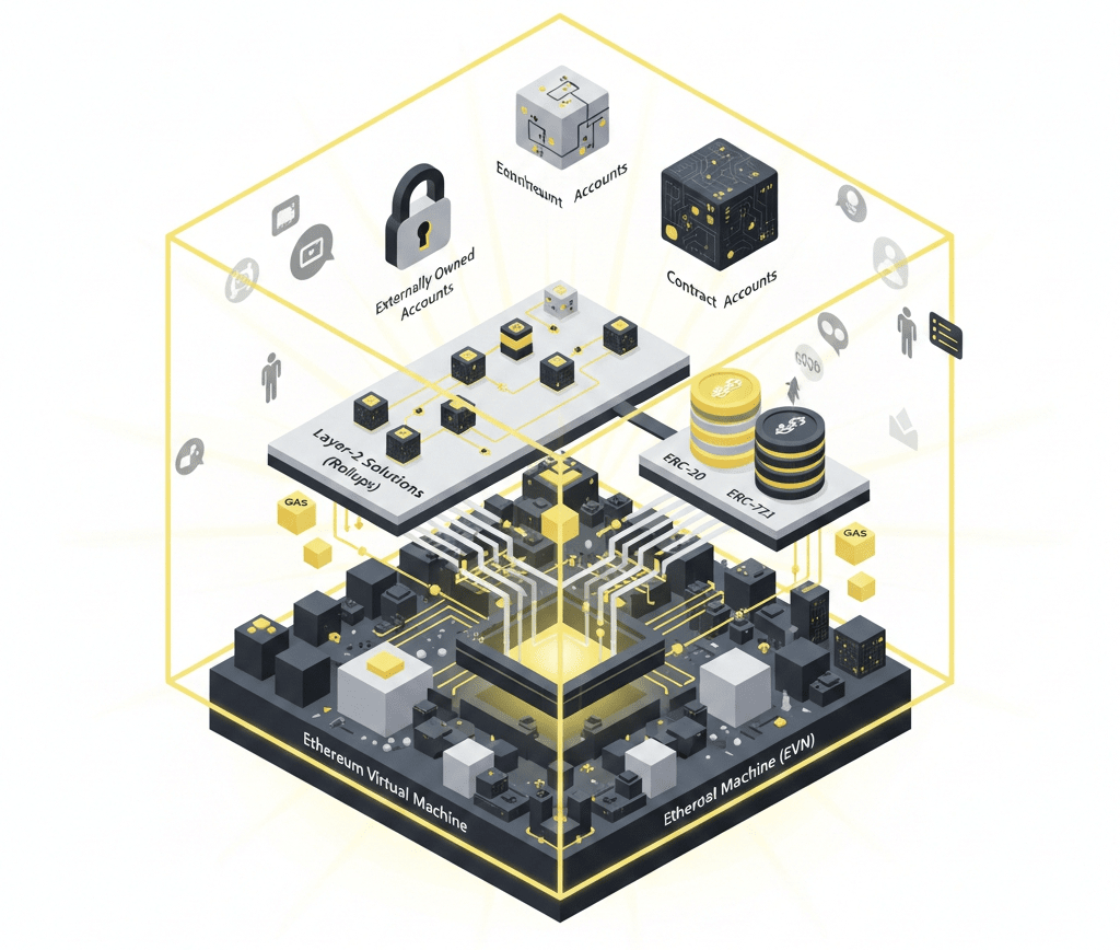 Na jego fundamentach leży Ethereum Virtual Machine (EVM), globalny silnik obliczeniowy, który wykonuje inteligentne kontrakty deterministycznie na wszystkich węzłach w sieci. Użytkownicy wchodzą w interakcje z Ethereum poprzez konta — albo zewnętrznie posiadane konta (kontrolowane przez klucze prywatne), albo konta kontraktowe (które zawierają kod i stan).