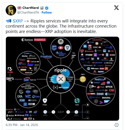 Insights shared by ChartNerd have renewed attention on Ripple’s expanding institutional footprint and its implications for XRP. The analysis points to Ripple’s growing role as a global payments infrastructure provider rather than a speculative crypto firm.