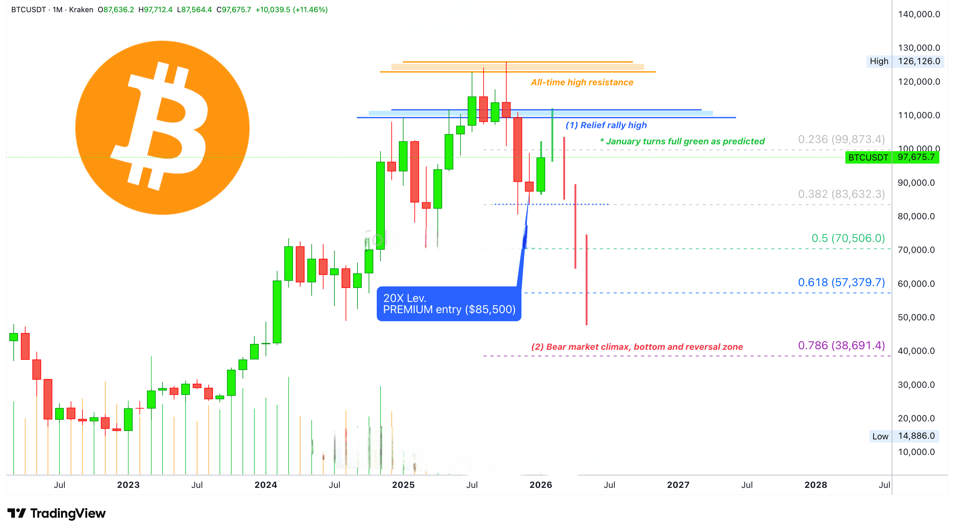 To samo. Załóżmy, że w marcu otrzymamy czerwone zamknięcie, ale to nie oznacza, że cały miesiąc będzie miał bearishowe działanie. Załóżmy, że marzec zaczyna się na poziomie 105 000 USD, a Bitcoin rośnie do 112 000 USD. Powoli, ale dochodzi do tego. Następnie zaczyna spadać, oscyluje w górę i w dół, ale miesiąc kończy się zamknięciem na poziomie 100 000 USD, co daje nam czerwone zamknięcie. 105 000 USD otwarcie vs 100 000 USD zamknięcie.
