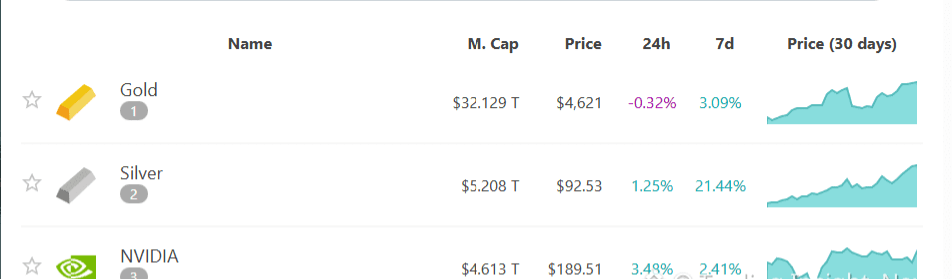 🔸 Kapitalizacja rynkowa srebra przekroczyła krytyczny barierę psychologiczną na poziomie 5 bilionów dolarów, wynosi teraz 5,037 biliona dolarów, ponownie przejmując pozycję NVIDIA.
