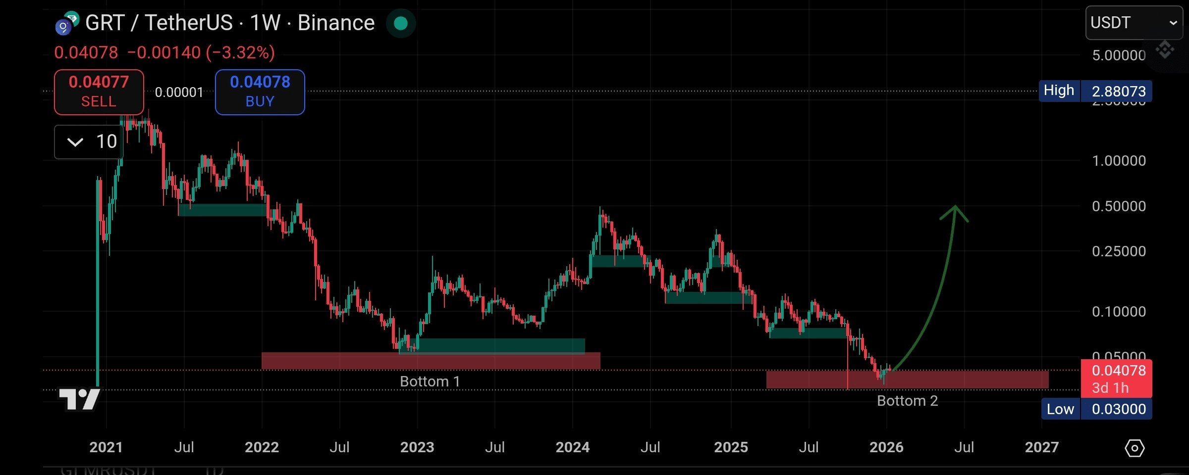 Silna okazja do odwrócenia na #GRTUSDT z formacją modelu "podwójnego dna" (W) doskonałego odwrócenia, wsparta pozytywnym momentum na RSI.
