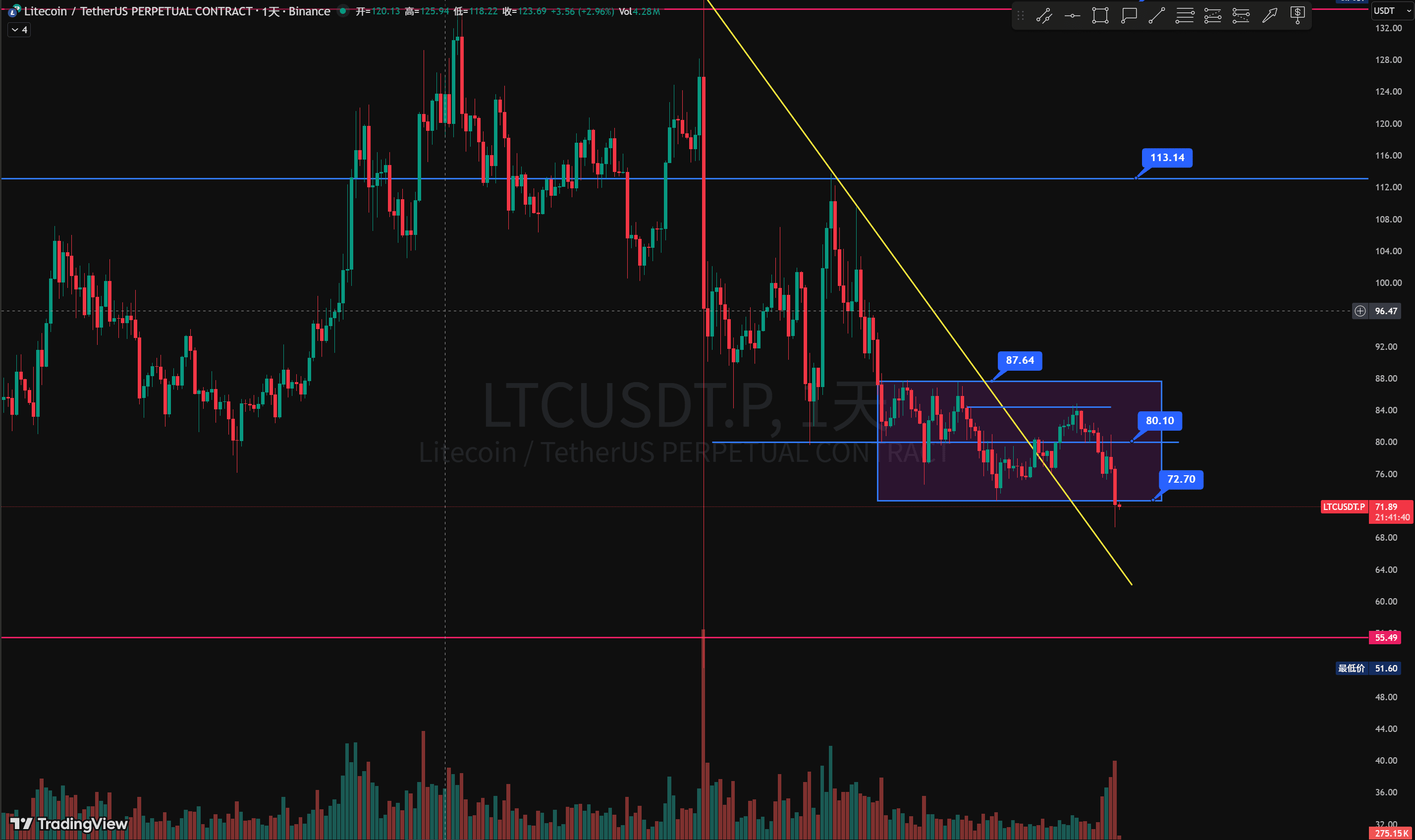 #LTC 从元旦这一波的拉升行情来看,辣条是比较弱的,只到达了84,然后就是一路下跌,近期更是跌破了盘整区下沿75附近,最低达到了69.3的位置。对于这种下跌且跌破盘整区的走势,不禁让人内心充满疑问,这是震仓吗?