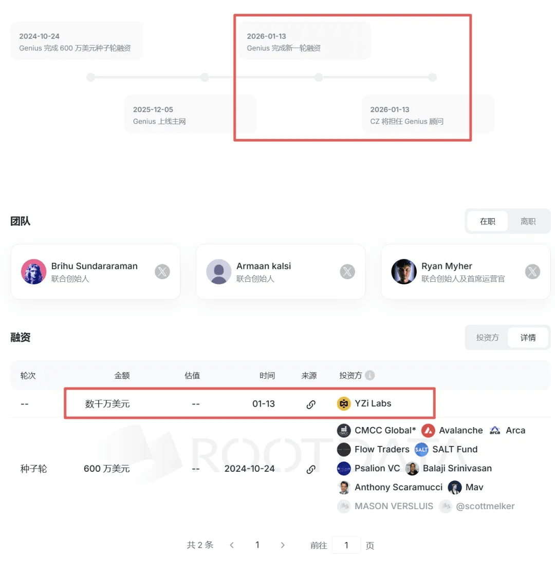 Genius zrealizował rundę seed, zdobywając 6 milionów, a także otrzymał "dziesiątki milionów dolarów" inwestycji od YZi Labs, założonego przez współzałożyciela Binance, Zhao Changpenga (CZ) oraz He Yi, a CZ dołączył do projektu jako doradca.