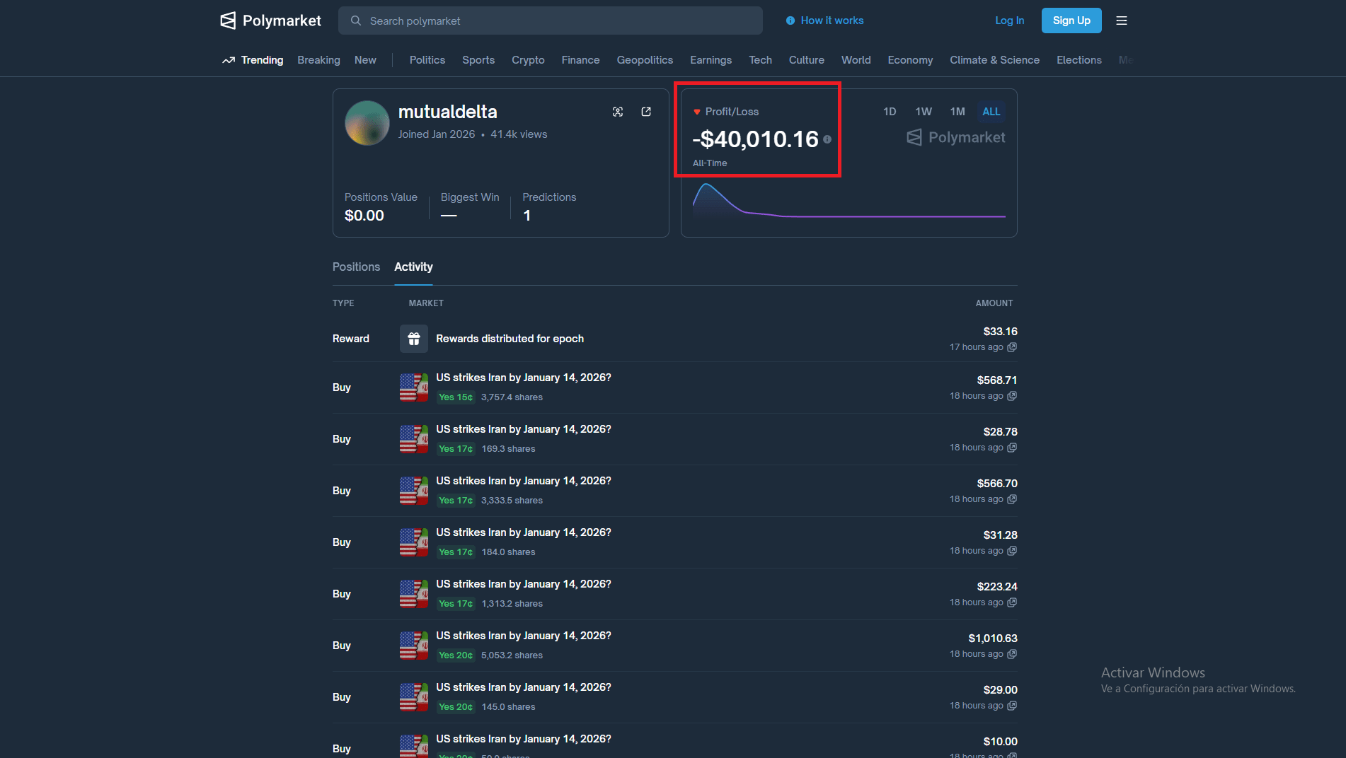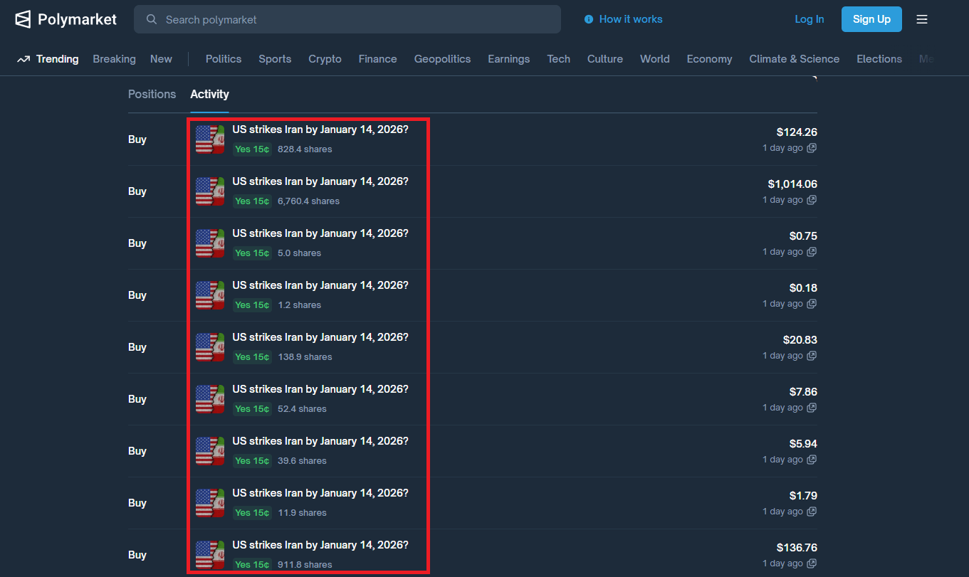 Tak więc, gdy konto na Polymarket zostało utworzone, Mutualdelta zaczęło kupować pozycje, stawiając, że Stany Zjednoczone zaatakują Iran 14 stycznia 2026 roku. Całkowita stawka wynosiła 40 000 dolarów.