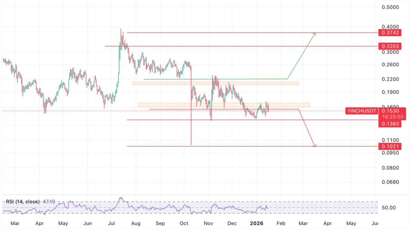 W tej chwili analiza techniczna pozwala nam jedynie zidentyfikować, że cena aktywa zmierza w kierunku poziomów ATL (najniższy poziom w historii), które wynoszą 0.1039 USDT.