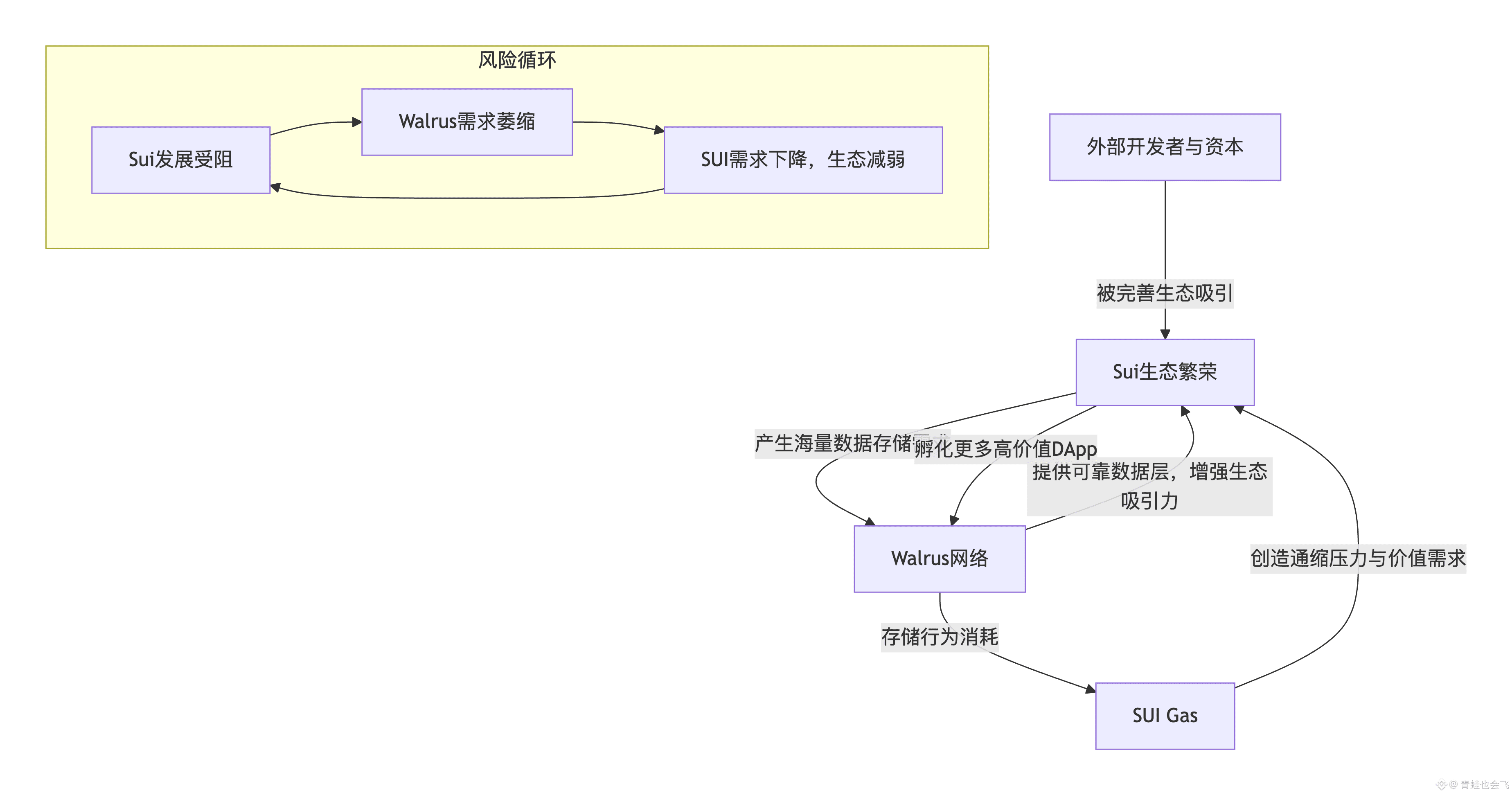 二者的经济模型也被精心设计成咬合状态。#walrus 存储行为消耗SUI作为Gas费,为SUI创造了持续的真实需求;而Sui生态的繁荣,特别是AI、游戏等高数据负载应用的发展,则为Walrus带来源源不断的业务。项目方更利用融资直接补贴Sui生态内的开发者,加速需求侧成熟。这种设计意在形成双向增强的经济飞轮,但其风险在于,如果飞轮的任何一侧(Sui发展或Walrus需求)失速,另一侧将受到显著拖累。