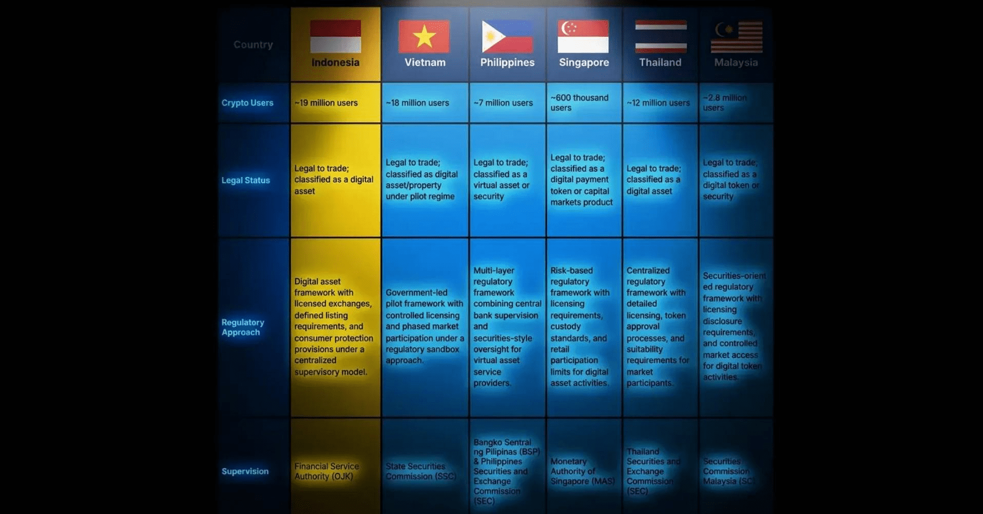 Znamy, czołowe kraje regionu Azji i Pacyfiku, takie jak Wietnam, mają 18 milionów użytkowników kryptowalut, Filipiny 7 milionów osób, Singapur tylko 600 tysięcy, Tajlandia 12 milionów, a Malezja 2,8 miliona aktywnych użytkowników.