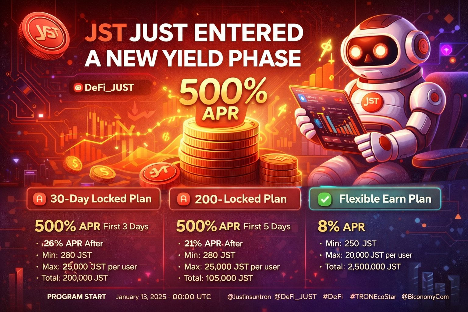 @DeFi_JUST wprowadził nowy zestaw produktów JST Earn, oferując promocyjne stopy APR przez ograniczony czas, sięgające nawet 500%. Projekt wyraźnie sprzyja wczesnym uczestnikom, jednocześnie wspierając długoterminowe uczestnictwo.