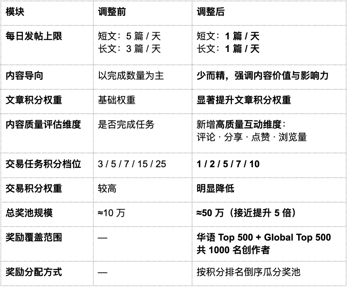 Rynek Binance, platforma zadań dla twórców, została całkowicie zaktualizowana, a od dziś obowiązuje: całkowita pula nagród w porównaniu do przeszłości wzrosła prawie pięciokrotnie, a obliczanie punktów bardziej uwzględnia każdą Twoją wysokiej jakości treść i interakcje.