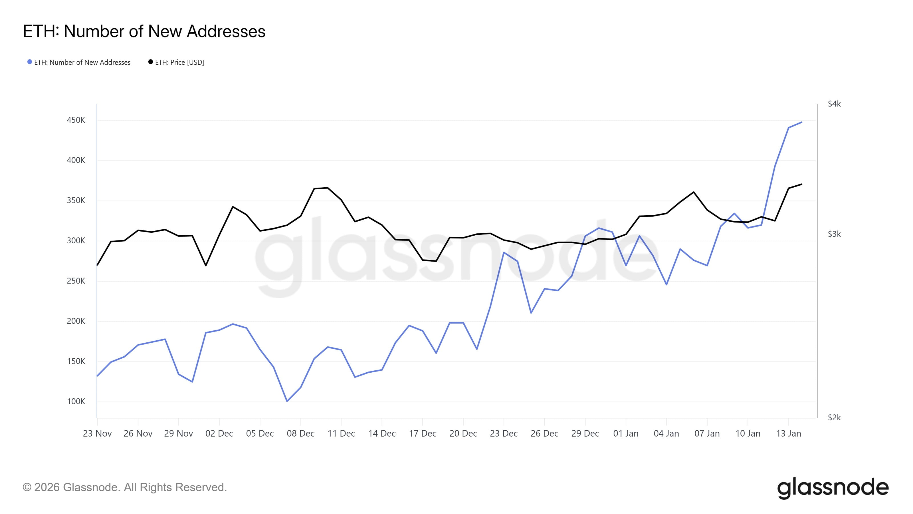 1. Rekordowy napływ nowych użytkowników: W ciągu ostatnich 24 godzin w sieci Ethereum stworzono 447 tysięcy nowych aktywnych adresów. To nie tylko maksymalny wynik od siedmiu lat, ale także znaczny wzrost w porównaniu z wynikami z zeszłego tygodnia (~300 tys. dziennie). Taki wzrost wskazuje na kształtowanie się organicznego popytu i rozwój ekosystemu.