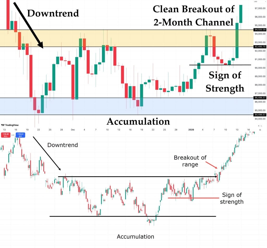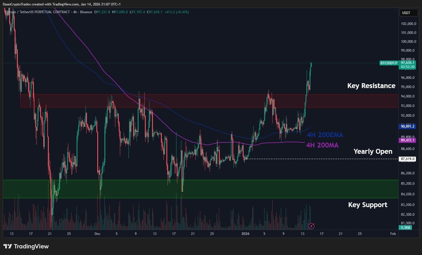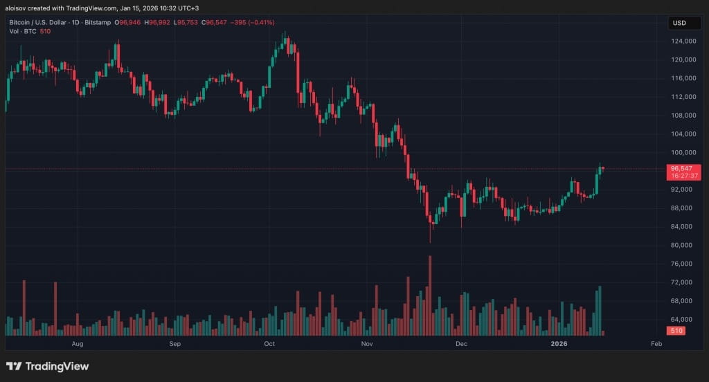 1. Przełom technologiczny: Po długim ruchu bocznym w przedziale 94 000 – 96 000 dolarów, bitcoinowi udało się przekroczyć ten poziom, osiągając wartość 97 939 na Bitstamp 13 stycznia. Analitycy uważają, że przełom zostanie potwierdzony, jeśli cena utrzyma 94 000 dolarów jako nową podporę.