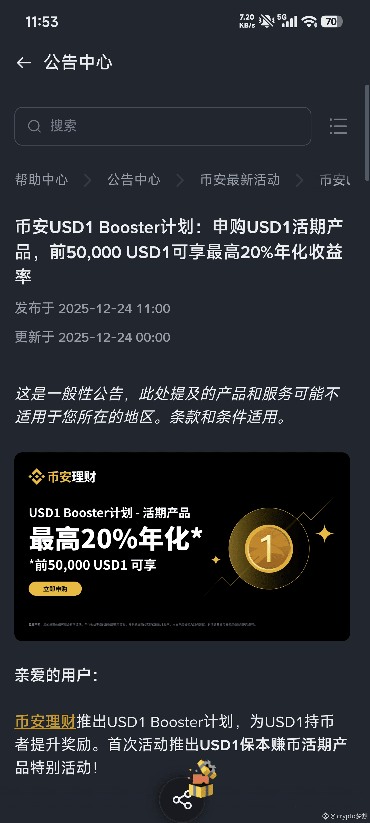理财活动初期,USD1 曾出现明显溢价,一度显著高于 1 美元锚定价格,目前已经回落至0.9989左右位置,如果你在高点买入,那就可能有点难受了。但考虑到最后几天抛压过去后应该会慢慢回到正常价位,所以大家不需要挤兑,毕竟usd1是具备合规性不容易脱瞄的。