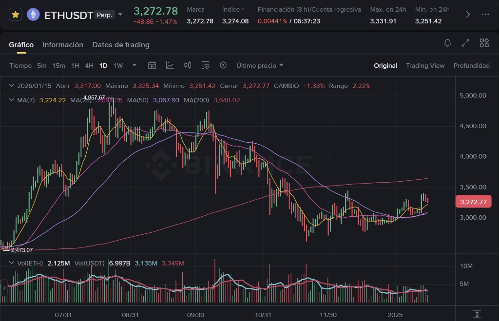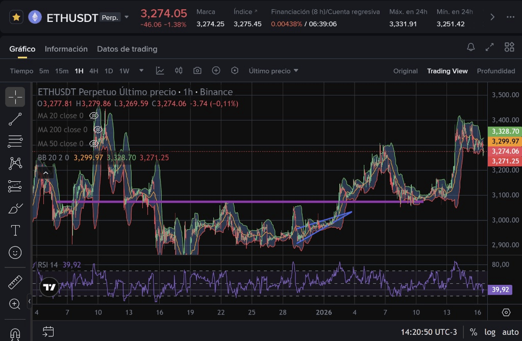 Obecnie rynek przeszedł z fazy ekspansji (euforii) do fazy kompresji i korekty. Świeczki dzienne pokazują, że chociaż byki próbowały przejąć kontrolę, podaż w górnej części była większa, co doprowadziło do powrotu ceny do średniej strefy handlowej (~3.270 USDT). To nie jest załamanie, to rynek "oddycha" po wysiłku.