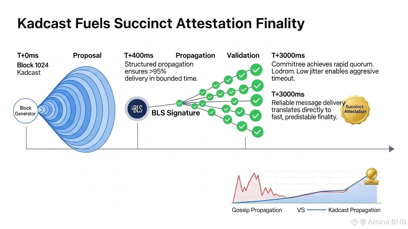 Ratification & Finality (T+3000ms): The same efficient process repeats for the Ratification Committee. The Succinct Attestation is formed and Kadcast to the entire network as the proof of finality.