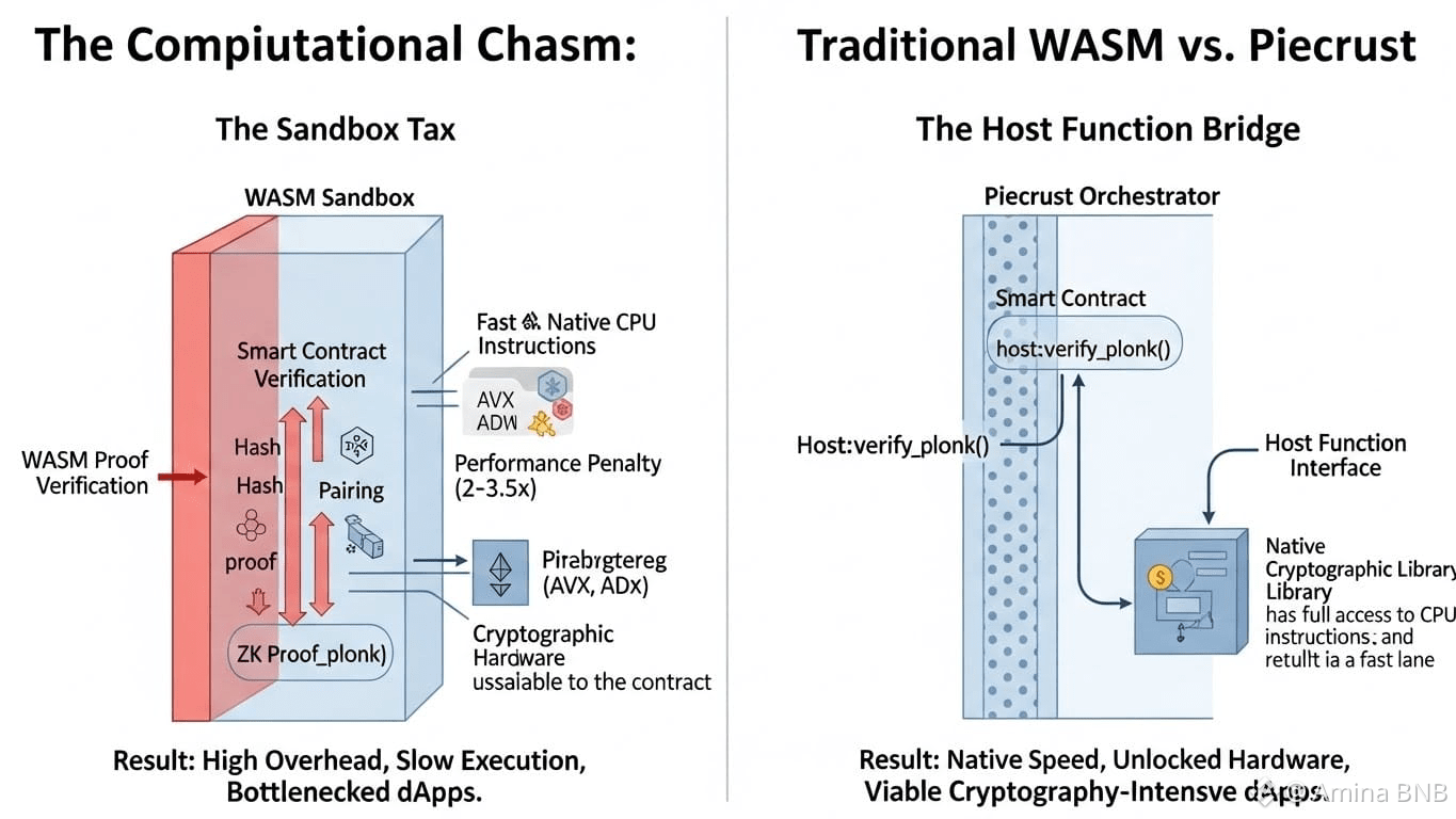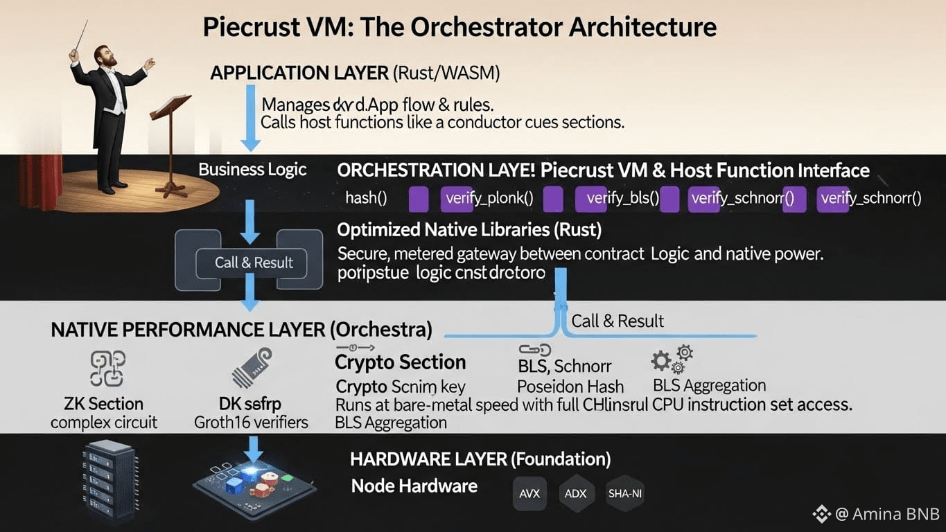 Dusk's answer is Piecrust, a virtual machine that performs a daring jailbreak. It doesn't just run WASM; it integrates a system of Host Functions that allow smart contracts to directly call optimized, native machine code for critical operations. This isn't an optimization it's a architectural revolution that redefines the relationship between a smart contract and the underlying chain. It turns the chain from a passive computer into an active co-processor, unlocking a new class of cryptography-intensive dApps that were previously unimaginable.