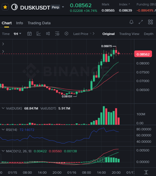 Bliskość do szczytów: Handluje bardzo blisko 24-godzinnego szczytu na poziomie $0.08975.