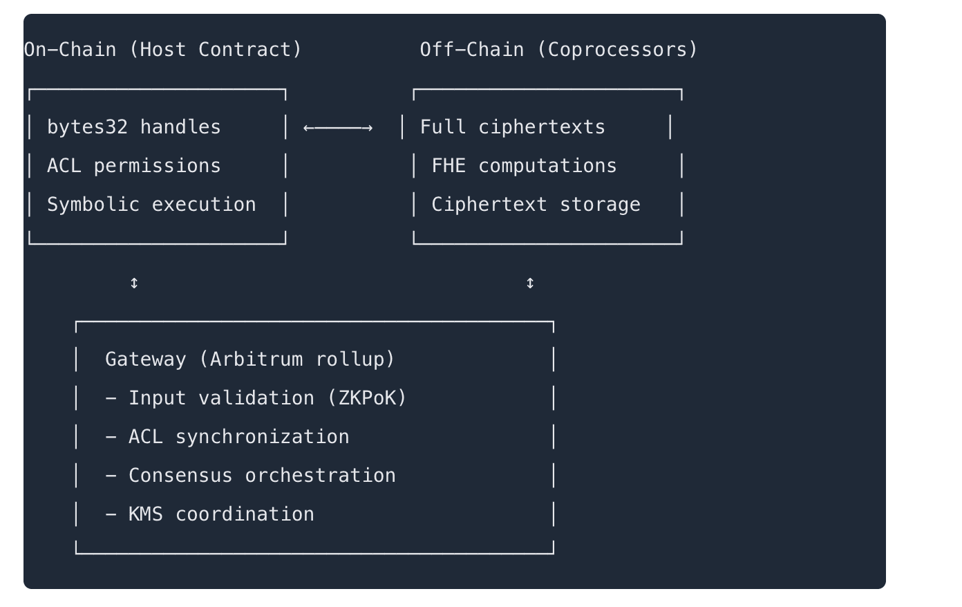 Kompozycyjność: Inteligentne kontrakty wykonują symboliczne wykonanie na uchwytach, emitując zdarzenia operacyjne dla przetwarzania FHE poza łańcuchem
