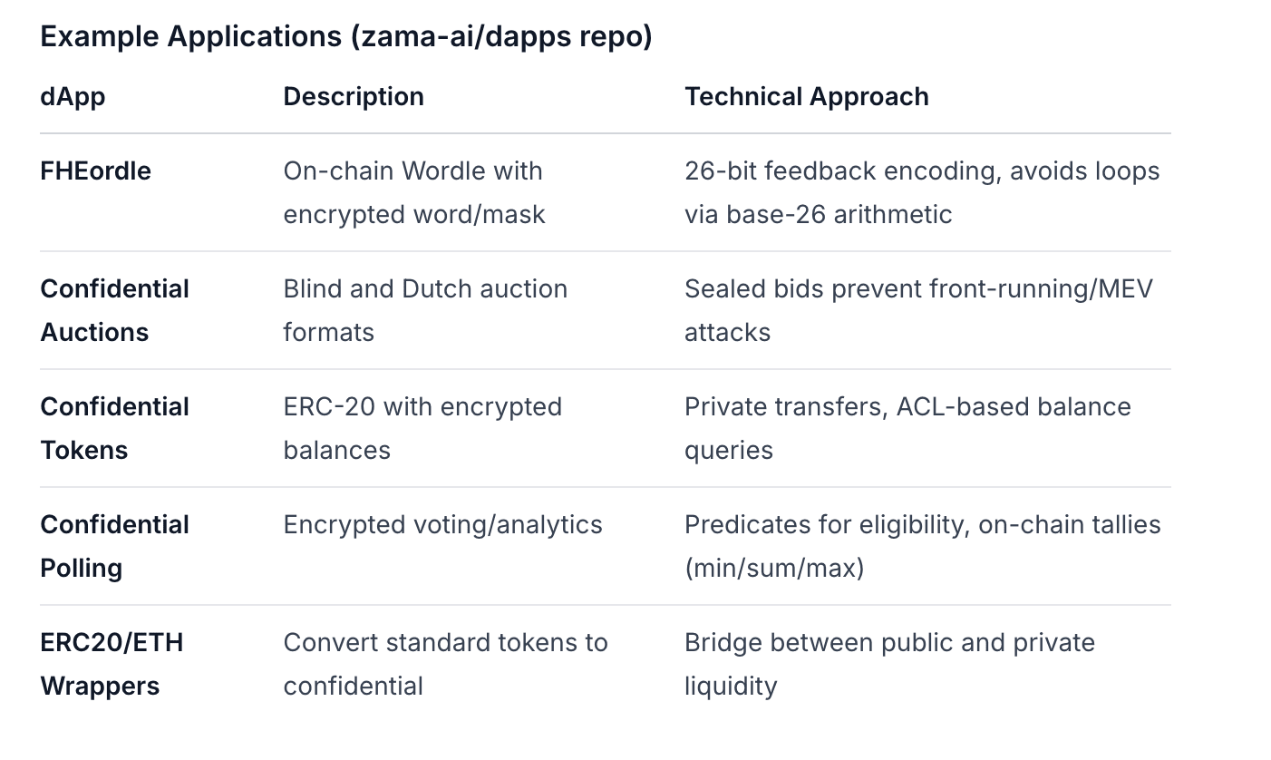 Przykłady: Tajne aukcje (ślepe/niderlandzkie), FHE Wordle (losowość na łańcuchu), PrivacyPad (prywatna platforma startowa). zama