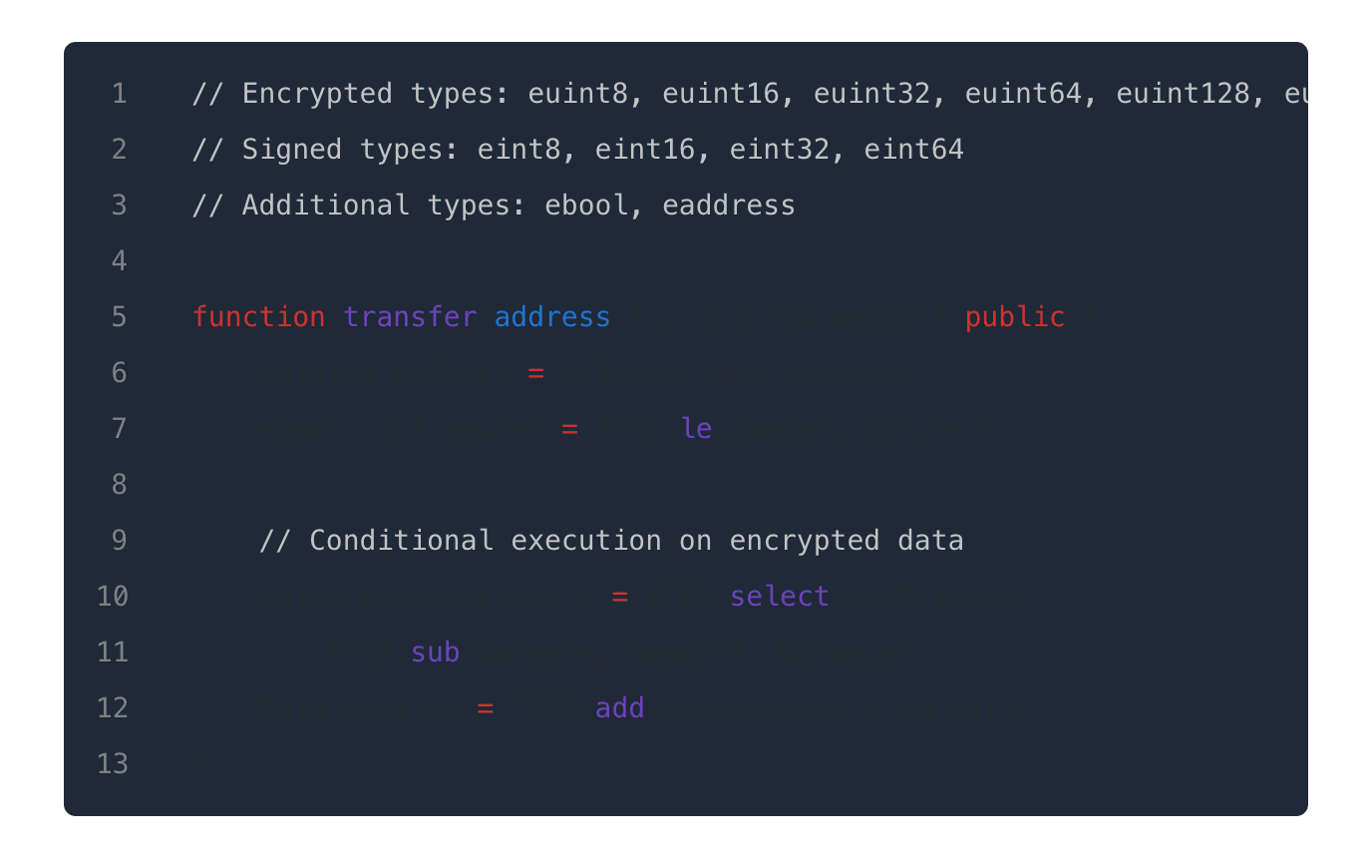 FHEVM dostarcza szyfrowane typy jako uchwyty bytes32 z standardowymi operacjami: