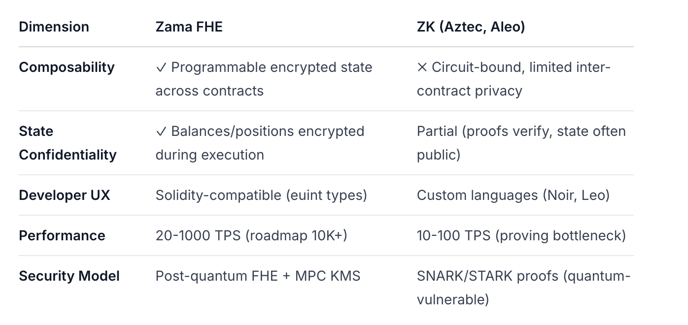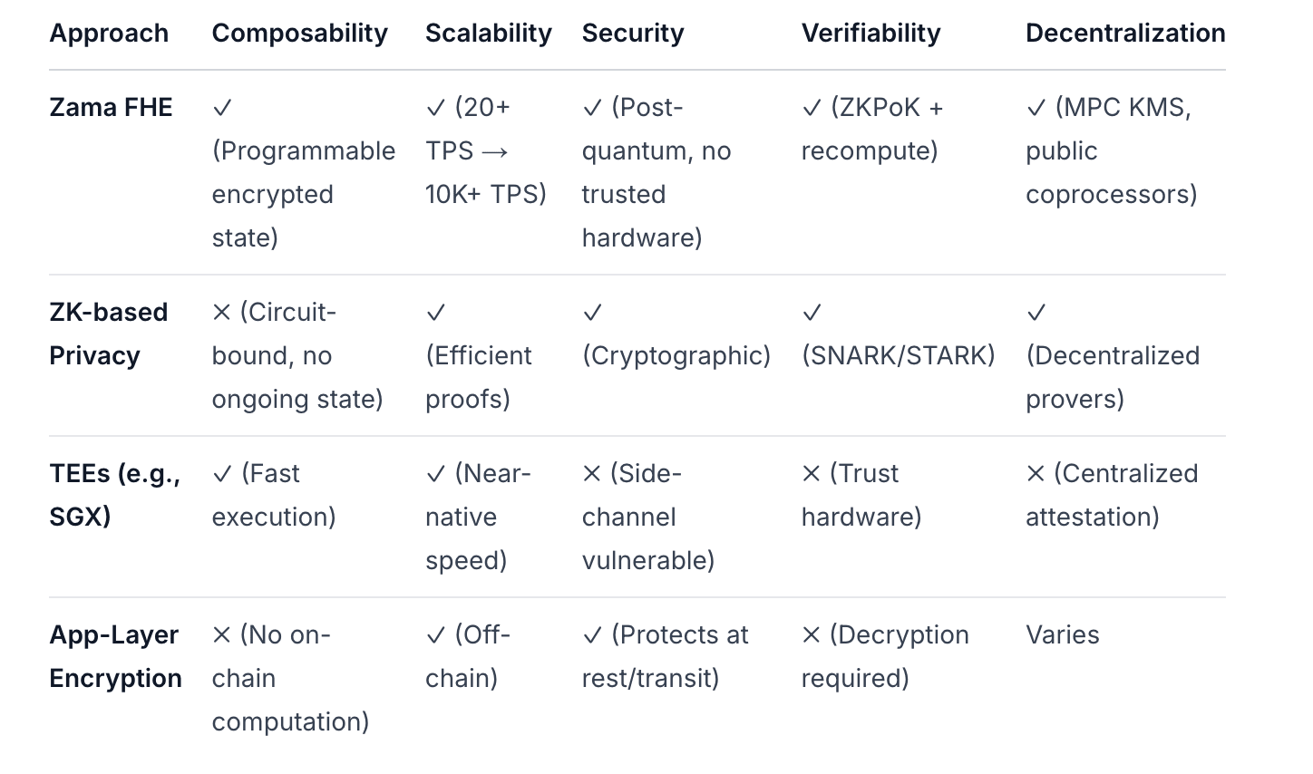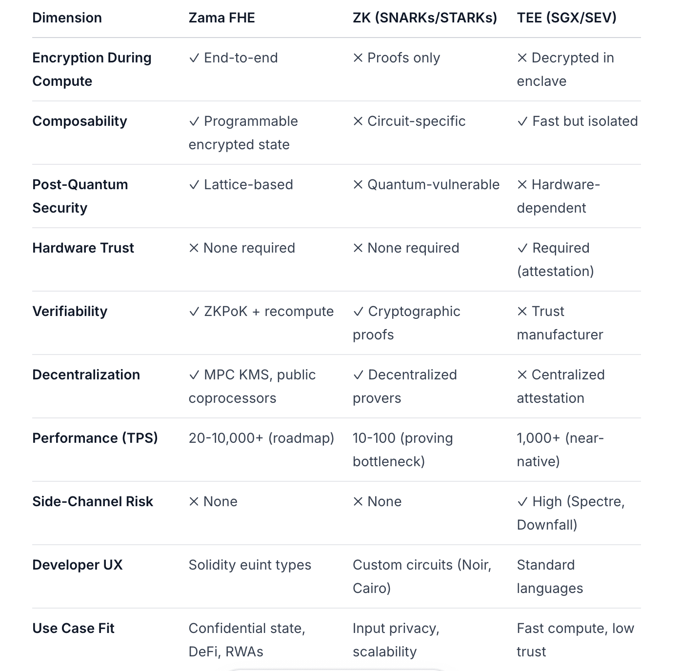 Porównanie tajności Zama vs ZK vs TEE