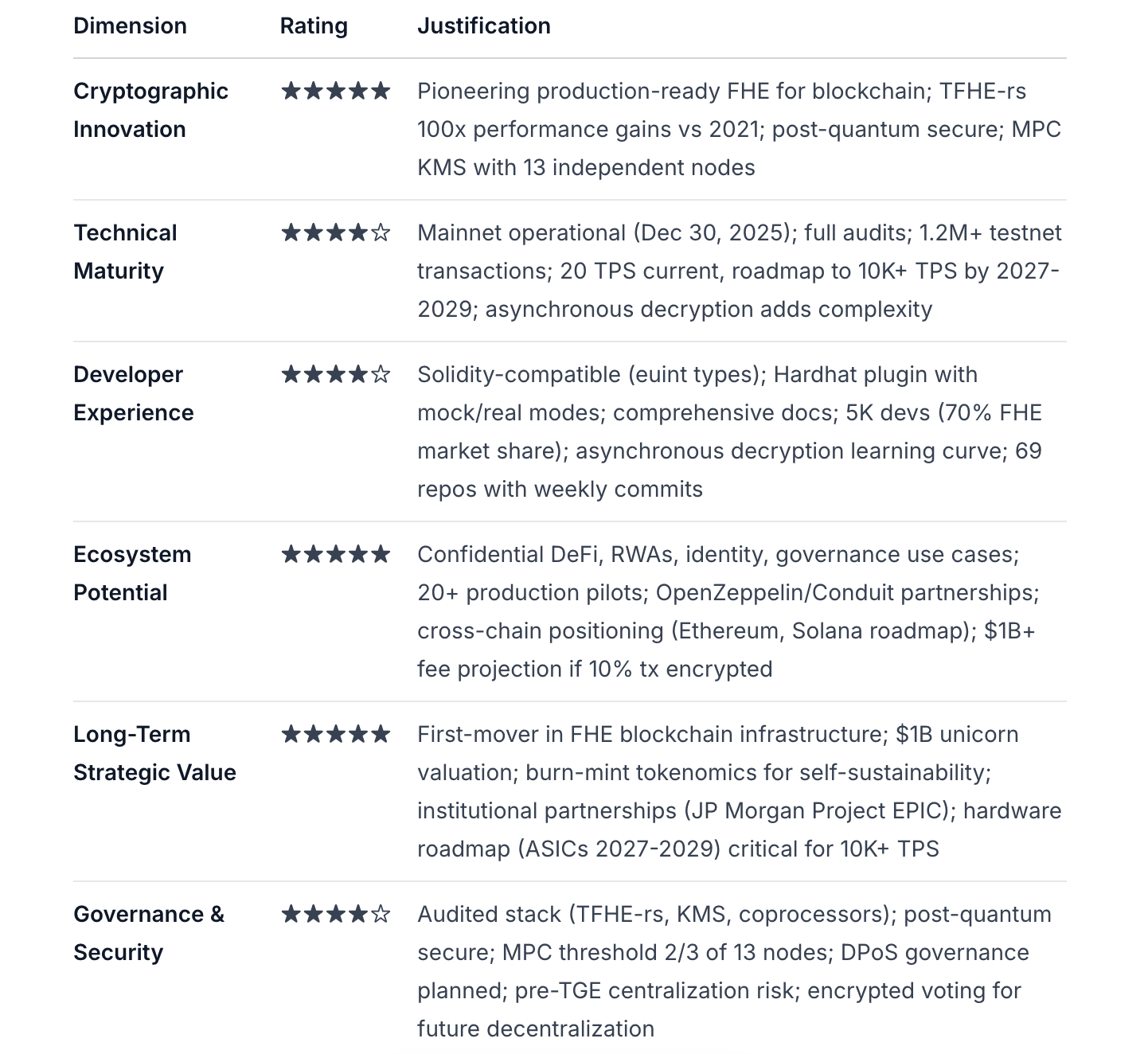 Dojrzałość ekosystemu: 5000+ deweloperów (70% rynku FHE), 20+ pilotażowych produkcji, strategiczne partnerstwa OpenZeppelin/Conduit.