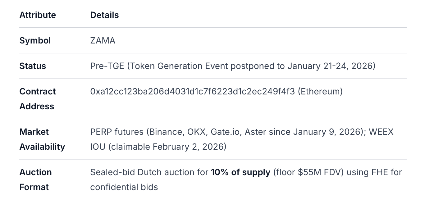 AttributeDetailsNameZama (Protokół Tajemniczy Blockchain Zama)Official Domainhttps://www.zama.ai/(primary), https://www.zama.org/(protocol)SektorInfrastruktura kryptograficzna / W pełni homomorficzne szyfrowanie (FHE) / Tajne inteligentne kontraktyCore MissionEnable confidential smart contracts and on-chain encrypted computation on existing public blockchains using FHE, MPC, and ZK primitivesStageProduction (Mainnet live December 30, 2025); Pre-Token Generation EventFoundedLate 2019 in Paris, France