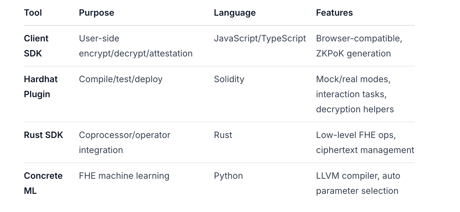 ModułOpisJęzyk/PlatformaStatusTFHE-rsCzysta implementacja Rust schematu TFHE wspierająca operacje logiczne i całkowite na szyfrowanych danychRust, C, API WASMProdukcja (v0.10+)ConcreteKompilator TFHE przekształcający programy Pythona na odpowiedniki FHE z użyciem API Pythona, akceleracja GPUProdukcja (v2+)FHEVMPełny stos integrujący FHE z blockchainem za pomocą biblioteki Solidity, współprocesorów, Bramy, KMSRust, Solidity, TypeScriptGłówny łańcuch (30 grudnia 2025)