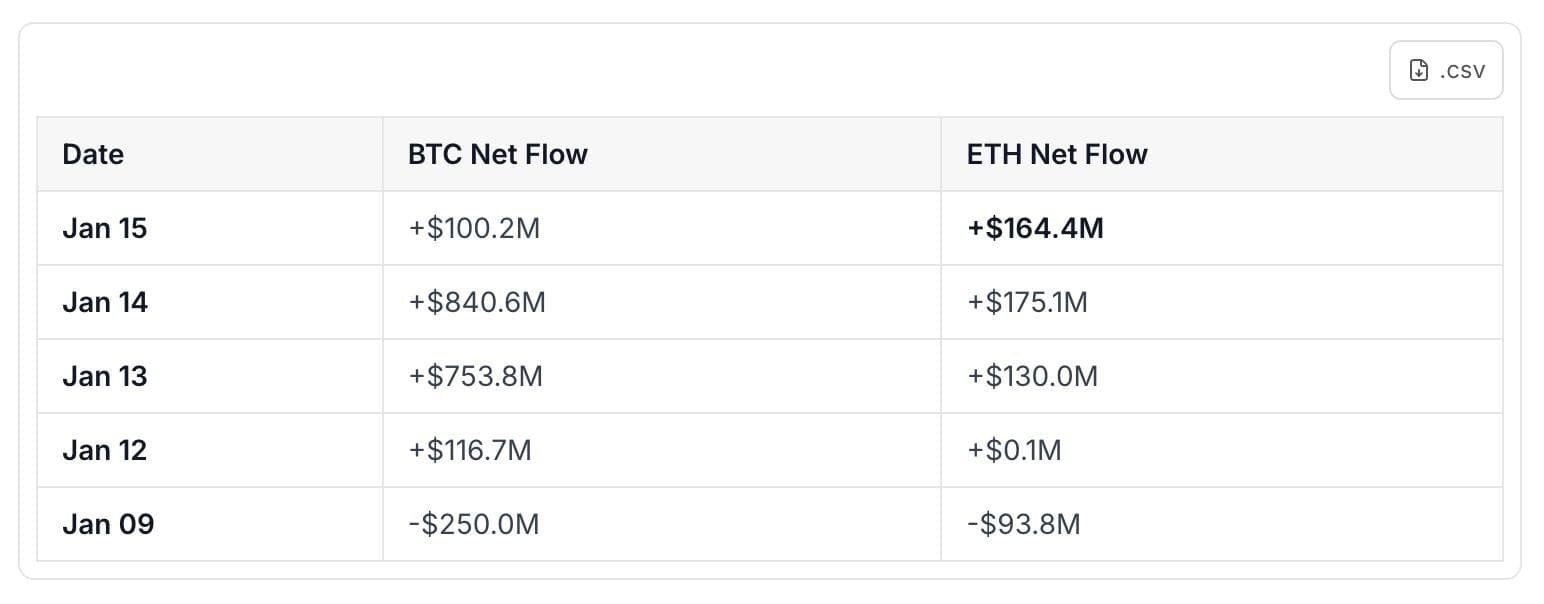 Co ważniejsze, to oznacza 4. z rzędu dzień wpływów dla obu aktywów, potwierdzając trwałe uczestnictwo instytucjonalne, a nie jednorazowy skok.