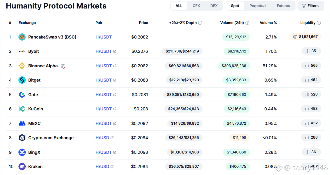 جاء ارتفاع بروتوكول الإنسانية (H) مدفوعًا بحجم التداول الفوري، الذي قفز بنسبة تزيد عن 148% وقت كتابة التقرير. ومن هذا الحجم، جاء حوالي 81% من سوق Binance Alpha، الذي سجل أيضًا أعلى درجة سيولة بلغت 565.