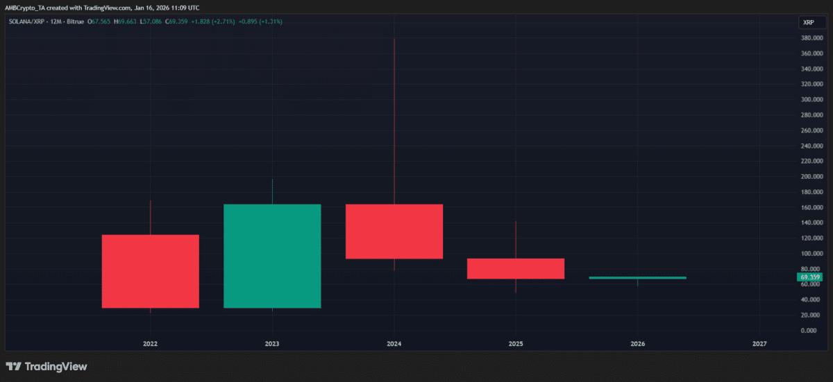 W rzeczywistości, do tej pory w 2026 roku, Ripple [XRP] nadal pozostaje w tyle za Solana [SOL]. Jednak patrząc na szerszy obraz, pojawia się inny krajobraz – cykl XRP w 2025 roku określił straty na poziomie tylko 12%, w porównaniu do 35% dla SOL.