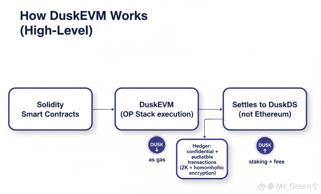 The phrase “EVM-compatible” gets used loosely in crypto, so it helps to be specific about what Dusk is doing. DuskEVM is presented as an EVM-equivalent execution layer built using the OP Stack. In simple language, the OP Stack is a framework that helps you run an EVM execution environment in a modular way. It’s a practical engineering choice, not a marketing badge. It lets Dusk inherit a mature execution design while focusing its own energy on the parts it cares about most: settlement, data availability, privacy, and compliance.