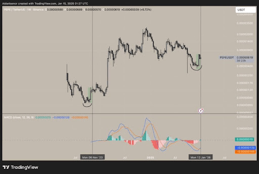 Analityk wskazał, że PEPE właśnie zarejestrował byczy przecięcie MACD na wykresie tygodniowym. Wykres pokazuje, że linie MACD tygodniowe przecinają się w górę, a momentum zmienia się z koloru czerwonego (spadkowego) na zielony (wzrostowy). Ten ruch następuje po długotrwałym trendzie spadkowym i zbiega się z ustabilizowaniem ceny oraz rozpoczęciem stopniowego wzrostu, co jest wzorcem często związanym z formowaniem zaokrąglonego dołka.