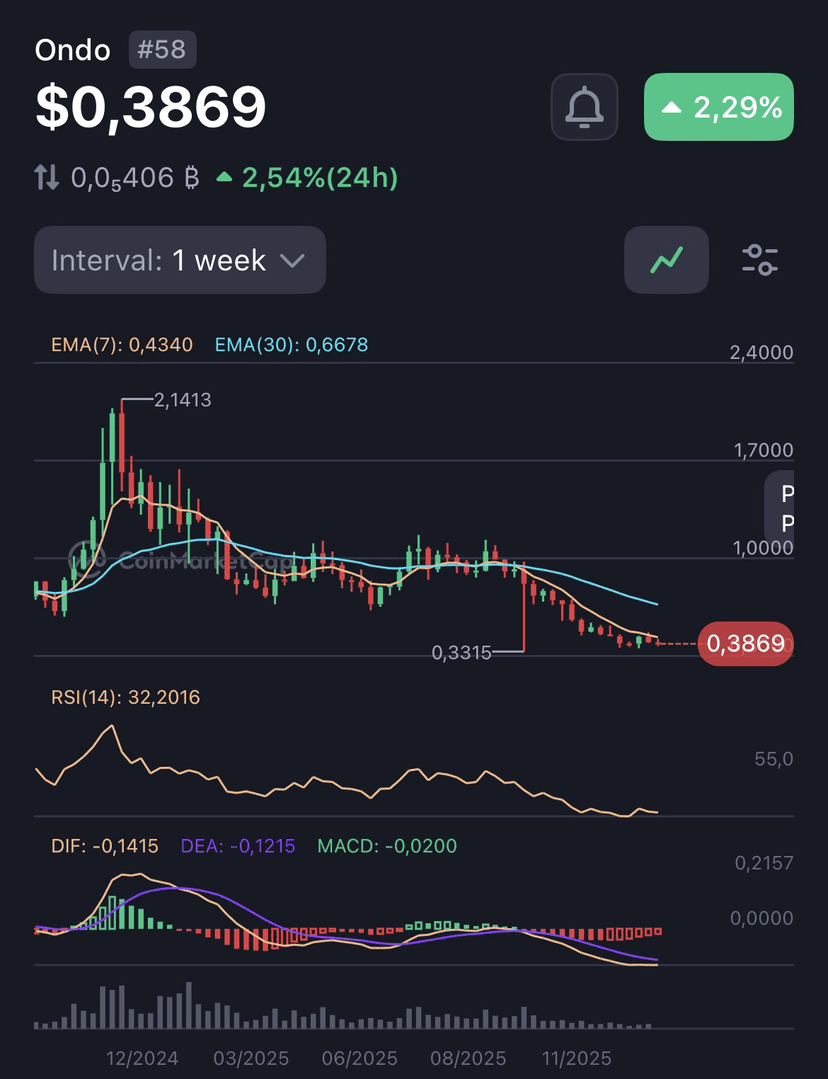 Długoterminowe perspektywy Ondo pozostają bycze dzięki jego przewodnictwu w tokenizacji aktywów w rzeczywistym świecie (RWA). TVL podwoił się do ponad 2 miliardów dolarów w ciągu niecałego roku, z integracjami takimi jak tokenizowane fundusze BlackRock, produkty powiązane z Fidelity oraz rozszerzenia na 24/7 handel na Solanie i partnerstwa z PayPal (poprzez konwersje PYUSD).
