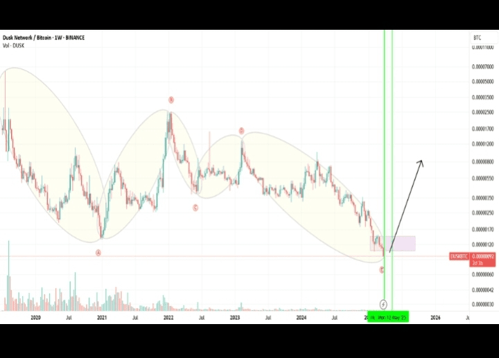 $DUSK niedawno przełamał wielomiesięczny trend spadkowy, pokazując odnowioną siłę byków, jeśli wybicie się utrzyma. Analitycy obserwują ruch w kierunku ~$0.10–$0.12 jako następne cele wzrostowe.